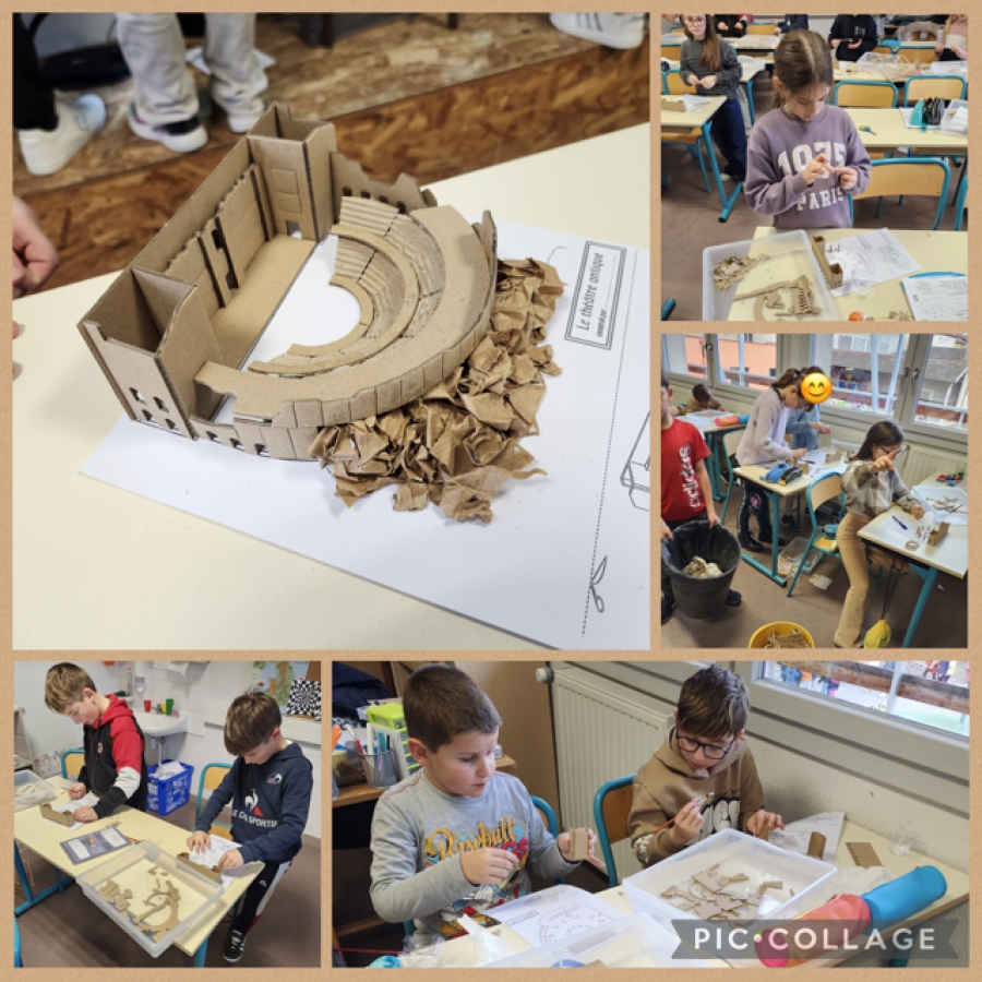 Les CM1 réalisent la maquette d'un théâtre antique, dans le cadre de leur projet sur la mythologie. Beaucoup d'attention et de concentration dans cet exercice!