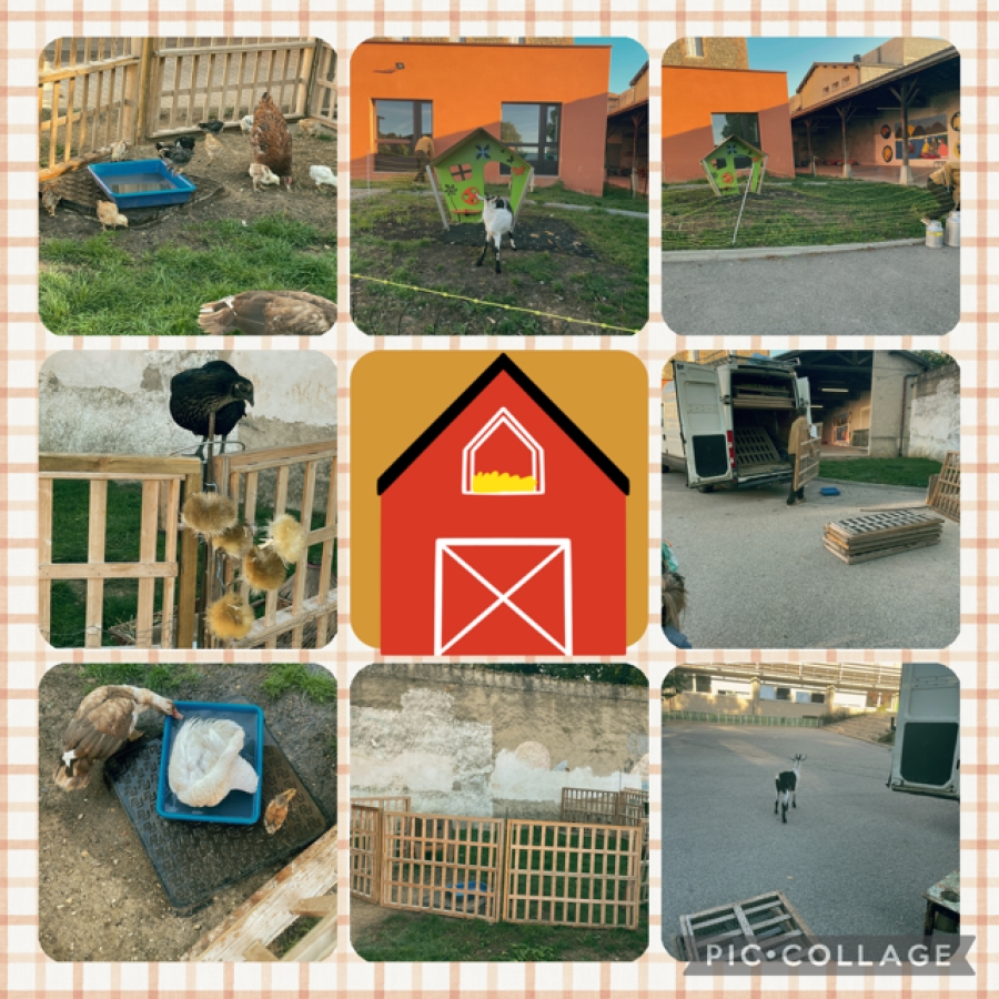 Cédric et Alex sont venus installer leur ferme itinérente à l'école cette semaine. Les voici en pleine installation avant l'arrivée des élèves ! Une des chèvres en a profité pour visiter la cour, très à l'aise...