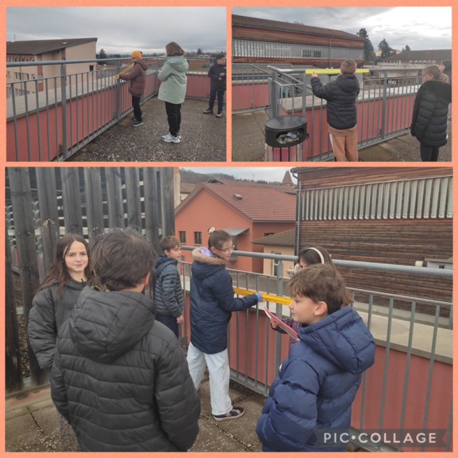 Les élèves de la classe de CM2 découvrent la notion de périmètre sur le toit terrasse.