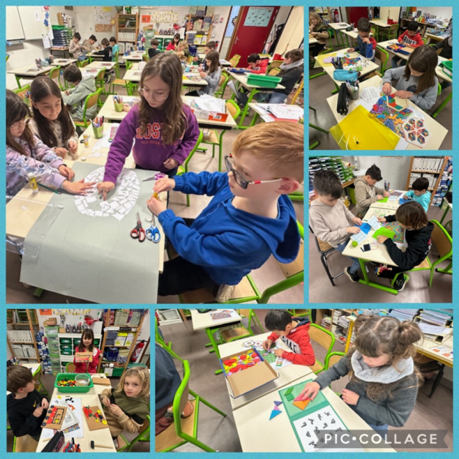 Les CE1/CE2 profitent des vendredis après midi pour améliorer leur dextérité : découpage et oeuvre collective, constructions diverses, élastiques ! Chaque atelier est très apprécié et permet de se poser, de partager de "faire ensemble" .